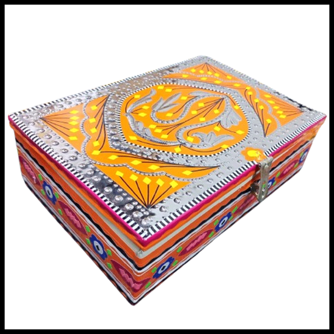 A magnificent specimen of traditional Pakistani workmanship, this Chamakpatti Box displays the elaborate and colorful art style that was influenced by truck art. This box, which is decorated with geometric patterns, reflective details, and vibrant floral motifs, is a useful storage solution as well as a work of art. Its sturdy build and safe clasp make it perfect for keeping things organized, and its vibrant and striking design brings color and culture to any area.