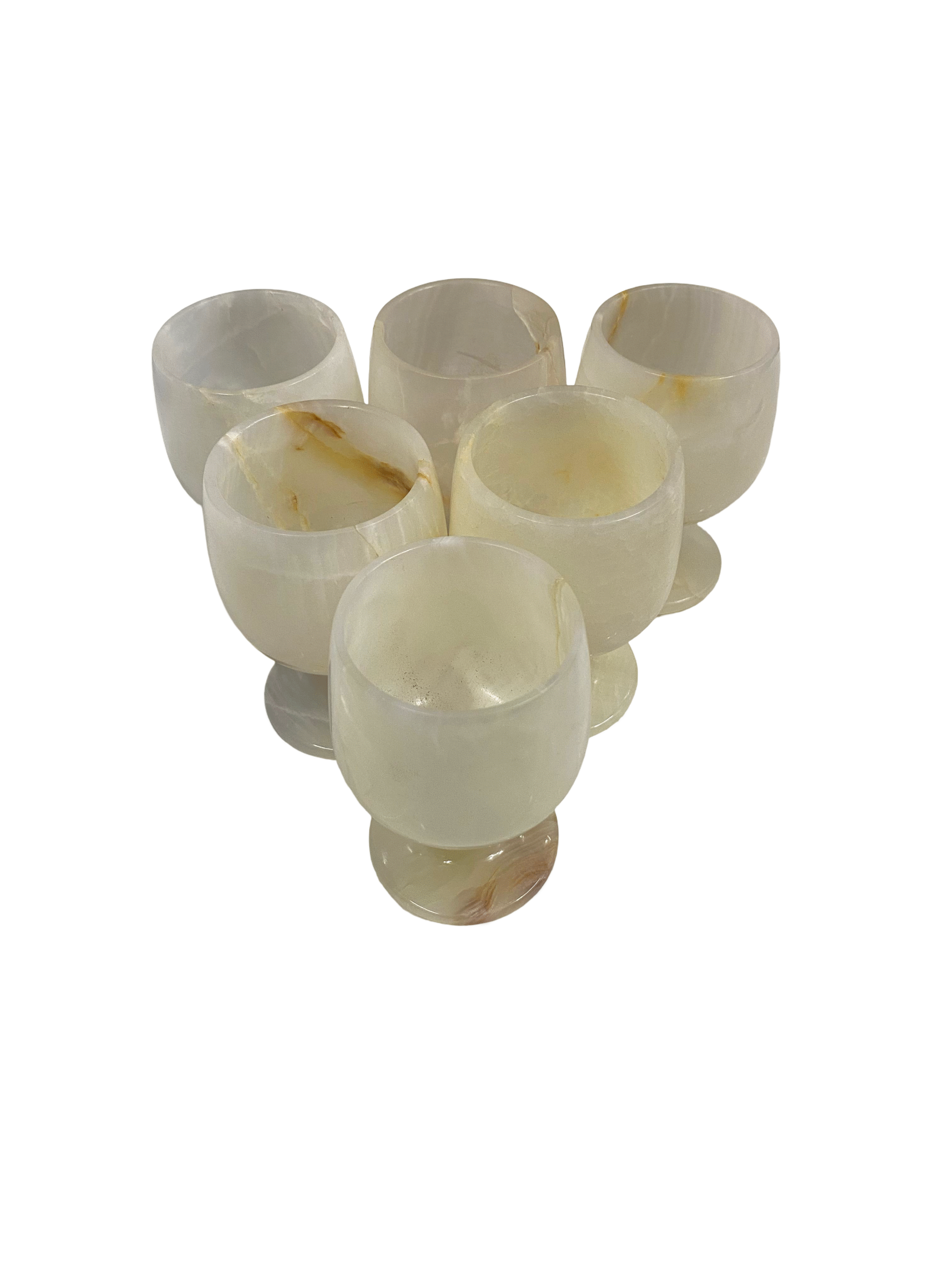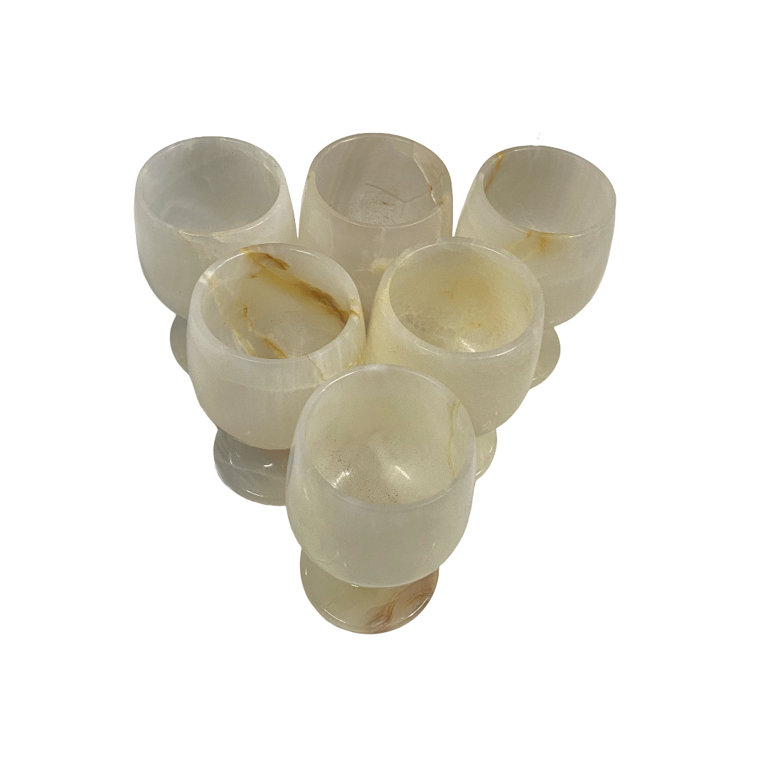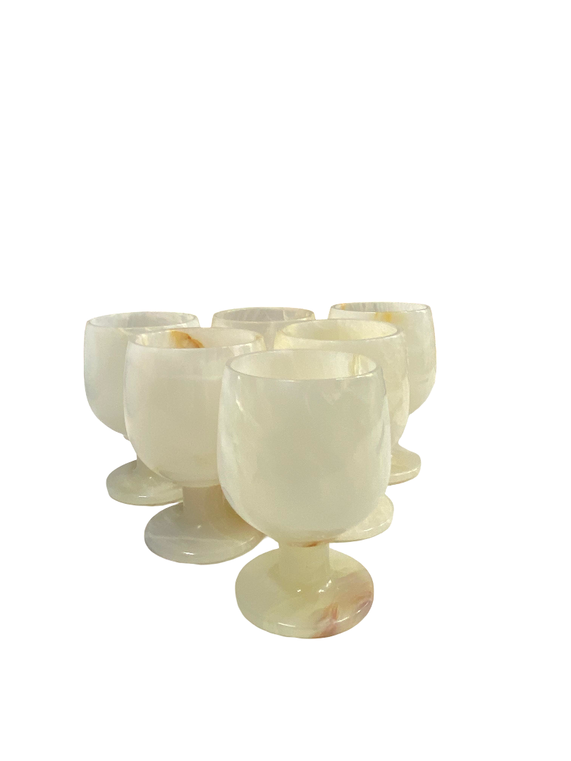 Bring a touch of elegance and timeless beauty to your home with these handcrafted Onyx Marble Wine Glasses. Expertly crafted by skilled artisans in Pakistan, each glass is a unique masterpiece, showcasing the natural beauty of premium-grade onyx marble. The smooth, polished surface and subtle color variations make these glasses stand out as both functional drinkware and stunning home decor.