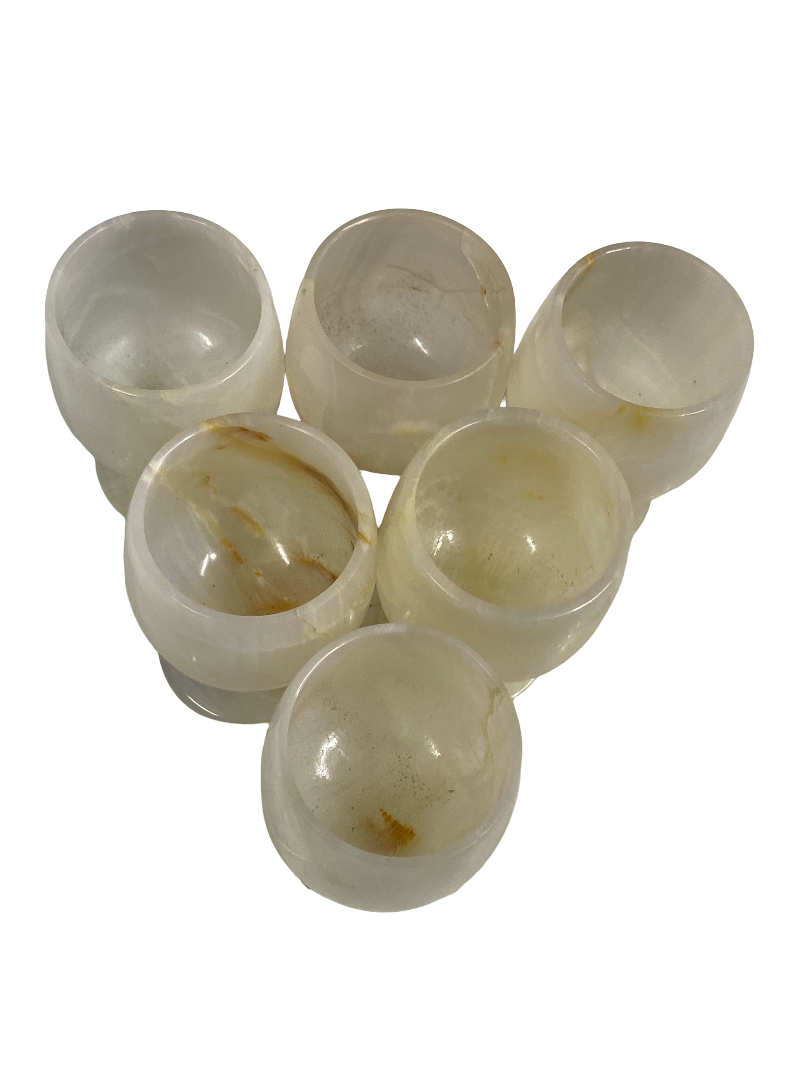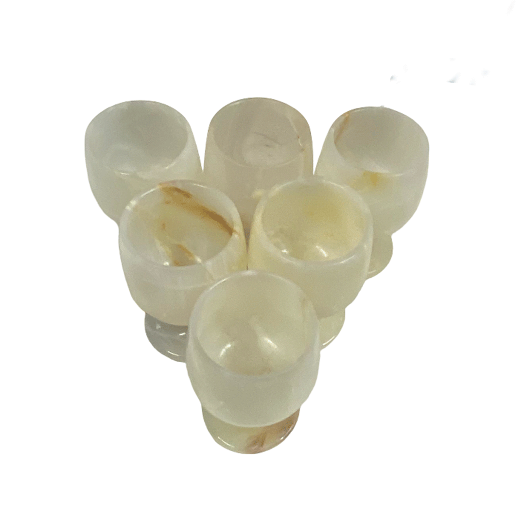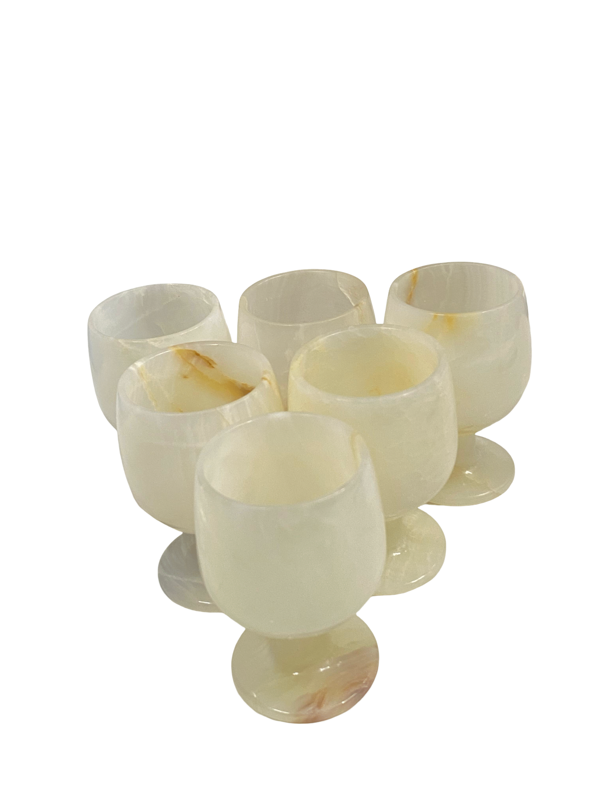 Bring a touch of elegance and timeless beauty to your home with these handcrafted Onyx Marble Wine Glasses. Expertly crafted by skilled artisans in Pakistan, each glass is a unique masterpiece, showcasing the natural beauty of premium-grade onyx marble. The smooth, polished surface and subtle color variations make these glasses stand out as both functional drinkware and stunning home decor.