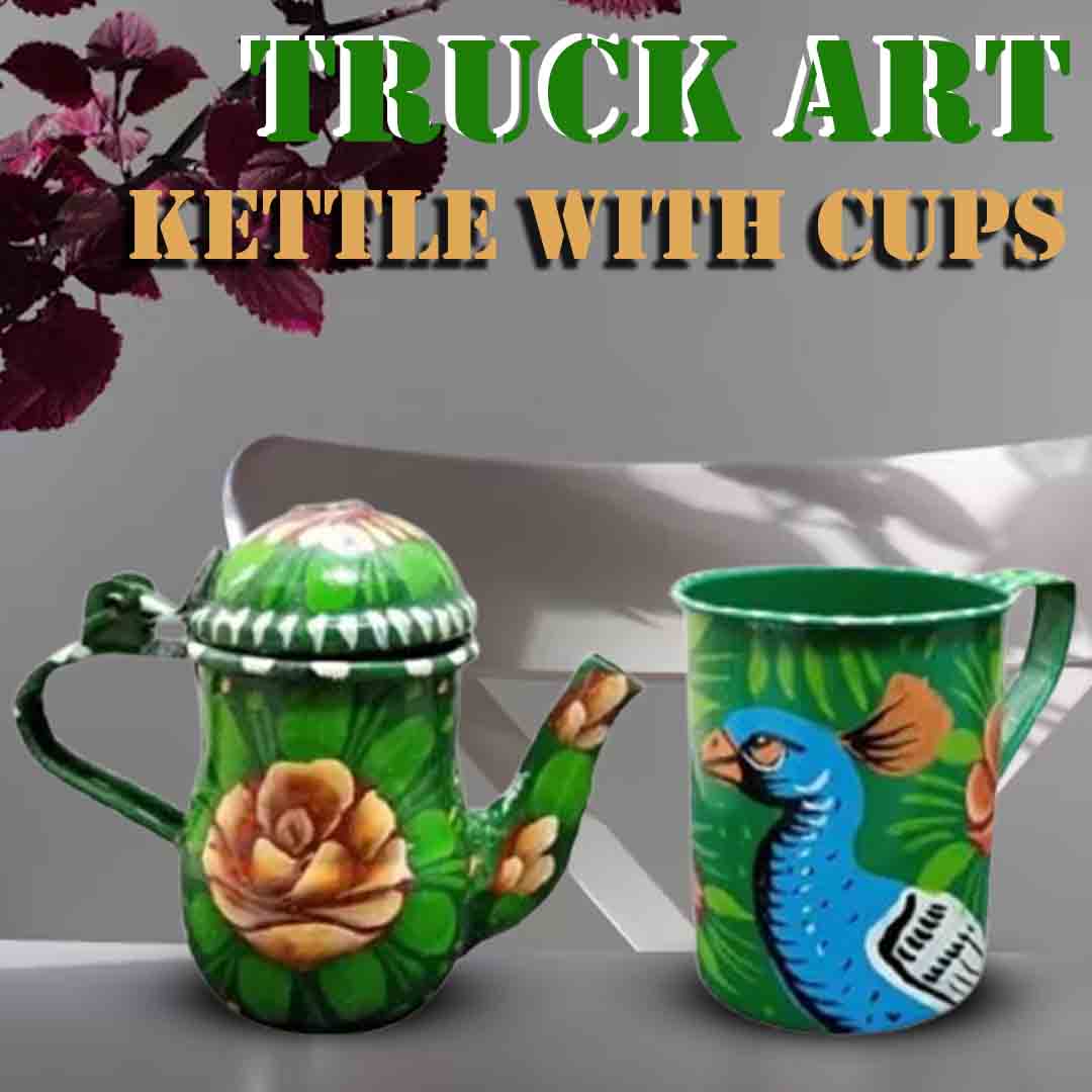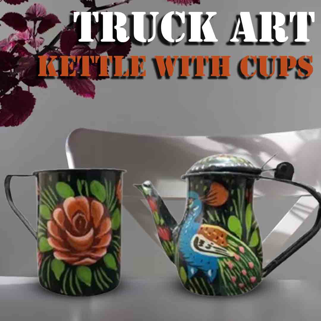 Hand painted table ware. Best selection of unique tea set. Beautiful decorative tea kettle with cups is truly a delight for art lovers and makes this set rare and precious. Each piece is adorned with motifs and patterns reflecting the unique and amazing Pakistani truck art. This artistic kettle set is perfect for gifting your love ones or any corporate occasion or event. Use them to decorate your space or pour tea for guests. Can be uses for coffee or tea and decorations for your home. Vibrant colors and floral designs. These beautiful cups can last an amazing impression on your guests. Get this durable, eye-catching truck art collection in reasonable prices. Luxurious designs that you can offer your visitors. Easily washable and spotless material.